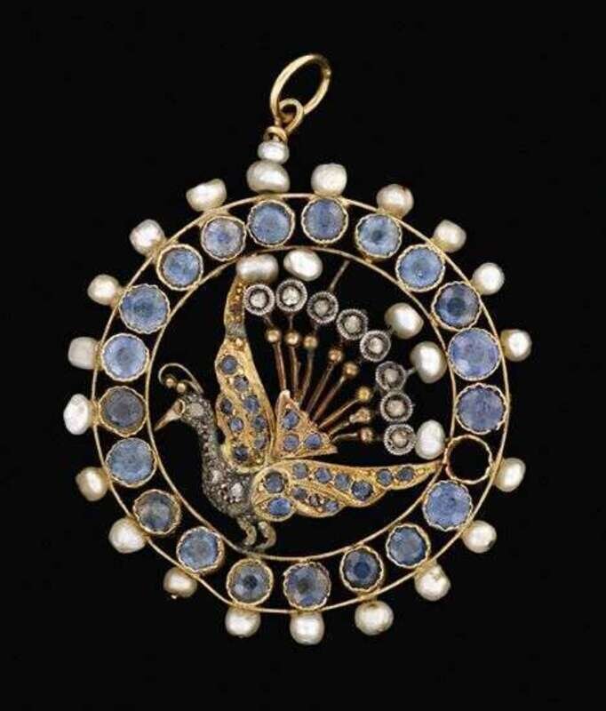 Crude circular cut sapphires in low karat yellow gold accented by fresh water seed pearls illustrating a peacock with open tail feathers within a sapphire and seed pearl frame.
