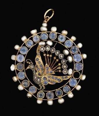 Yellow gold sapphire and seed pearl peacock pendant georgian