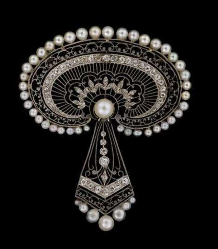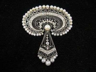Fifty-nine petite round cut diamonds of graduated size framed by forty-eight graduated cultured seed pearls. Top fan form portion is accented by kite shape articulated pendant.