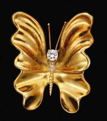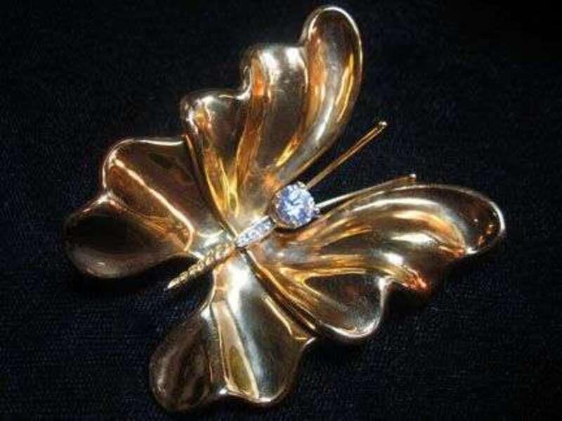 Delicate butterfly brooch, accented on the body by three petite cut diamonds and one single cubic zirconia stone.