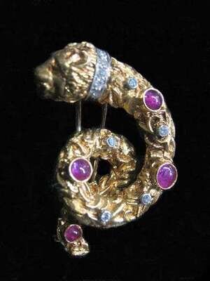 Carved lion's head is followed by textured curled body, accented by four cabochon rubies and eleven petite circular cut diamonds. Signed Zolatas, 750.