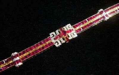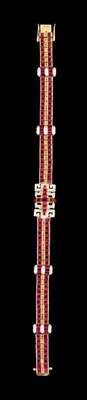 Fifty-four square cut rubies in double sided links, four tourbillion accents each set with six baguette cut rubies, and accented by petite round cut diamonds. Double safety catch slide box clasp marked no. R7448.