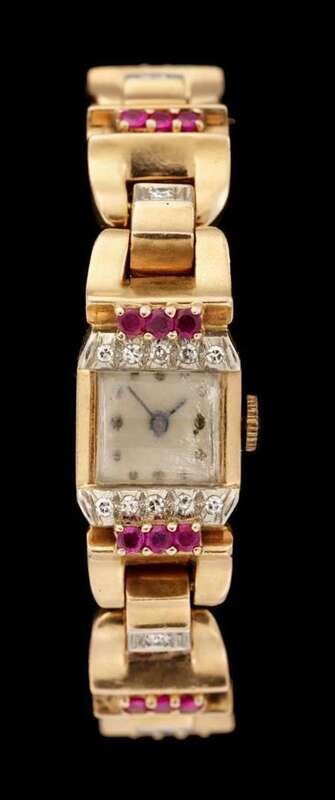 Ruby and diamond set cocktail watch with square silver tone face, featuring a dot dial. Movement stamped 26329 "Pery Watch", case stamped "120199". Reverse in engraved "Shirley from Mom and Dad, June 6th 1945".