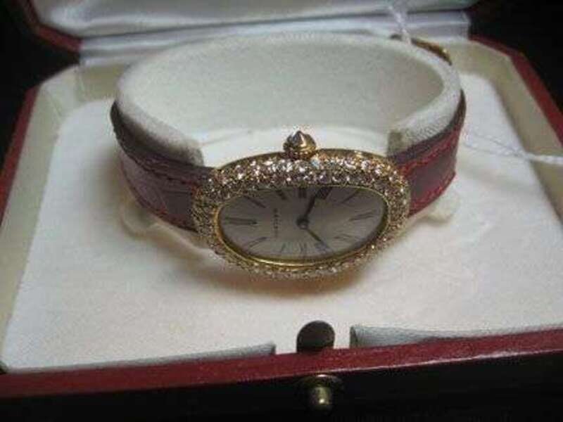 Approximately seventy circular brilliant cut diamonds surrounding an oval cream colored enamel face with Roman numeral dial stamped Cartier. Case is marked "Cartier, 750" case no. 033495. Accompanied by original wristbands, presentation box and certificates.