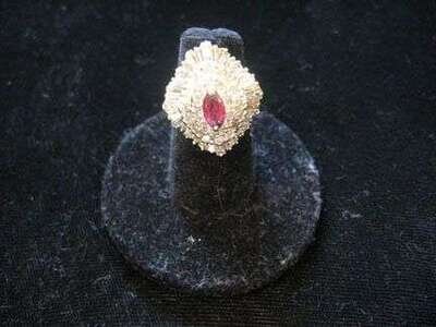 Ballerina setting of tapered baguettes, and petite round cut diamonds, framing a marquise cut ruby in the center. Total diamond weight approximately 1 carat.