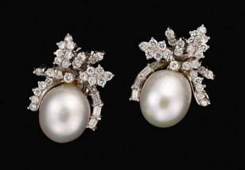 Ovoid white Tahitian pearls nestled in diamond set "leaf and vine" motif, clip back.