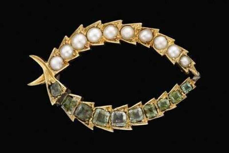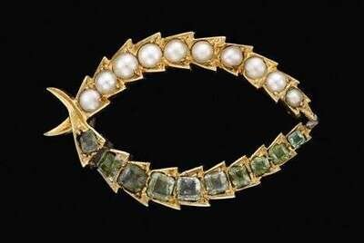 Ten crude "Asscher" cut peridot, prong set into a leaf form brooch frame, alternating with ten split cream luster seed pearls.