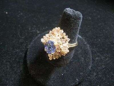 London blue sapphire set amongst twenty baguette cut diamonds accented by twenty-six circular cut diamonds. Total diamond weight approximately 1 carat.