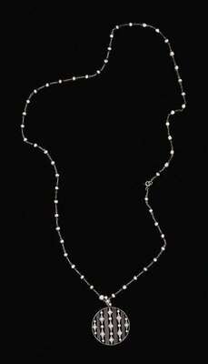 Thin link with alternating pearl accent and a single circular filigree disk pendant set with petite round cut diamonds and seed pearls in alternating marquise circle design.