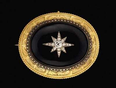 Onyx disk set into 14 karat yellow gold, hand etched setting, open framed back (where a hair memorial might be added). The brooch is accented by a Moravian style star in the center set with Old Mine cut diamonds in sterling silver. Can be worn as a brooch or as a pendant.
