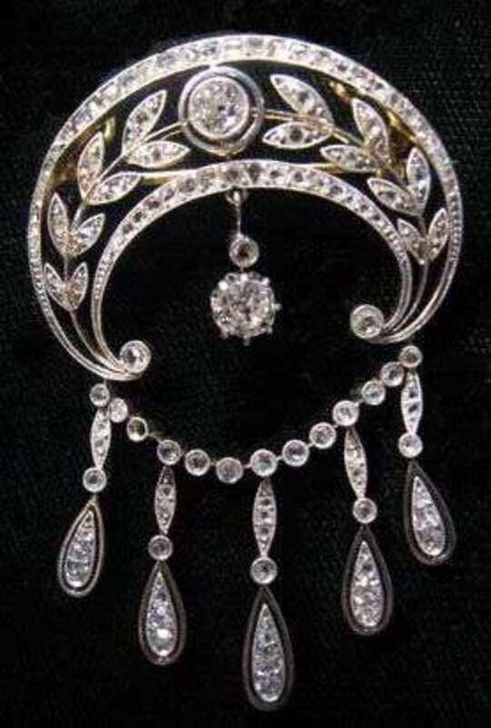 Platinum topped yellow gold brooch displays over one hundred Old Mine and rose cut diamonds. Top garland frames one single .25 carat Old Mine cut diamond, with lower garland from which pear shaped drops dangle. Brooch can be worn as a pendant.