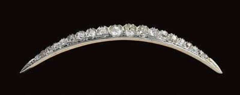 Platinum topped gold with twenty-one old mine cut diamonds of graduated size set into a traditional crescent shape. Total weight of diamonds approximately two carats.