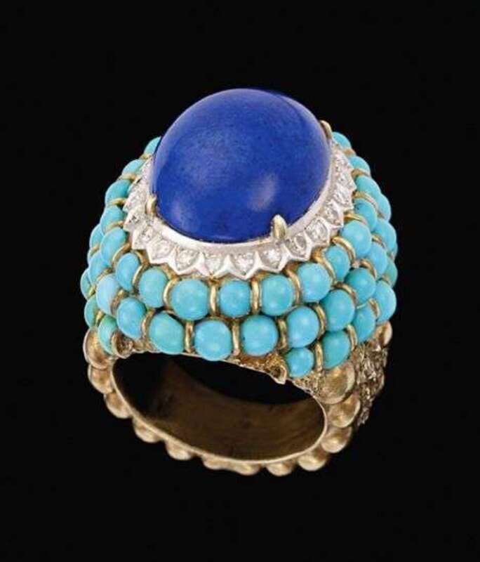 14 karat yellow gold bombe style lapis and turquoise ring 1960s