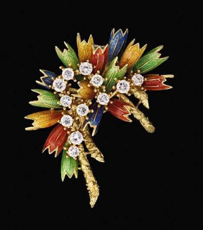18 karat yellow gold diamond and enamel brooch