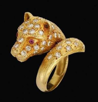 18 karat yellow gold ruby and diamond "panther" ring