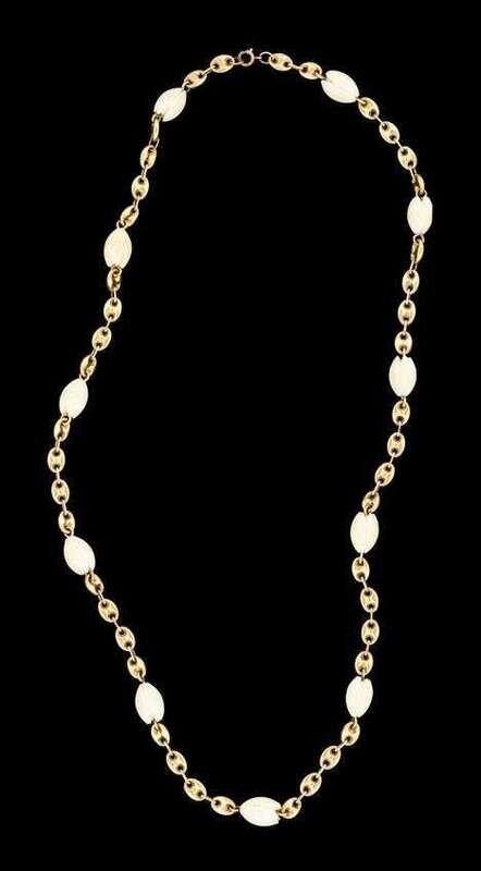 "Gucci" style yellow gold link alternating with large carved ivory closed "lily" blossoms, signed 750.