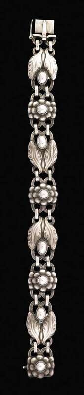 Traditional sterling silver bracelet with abstract Jensen design of eight alternating links, slide box clasp with safety catch.