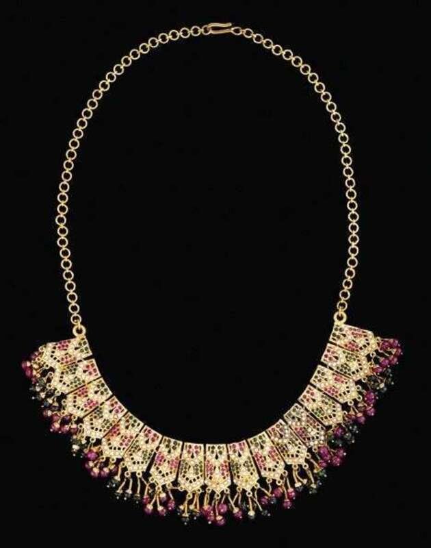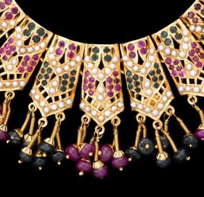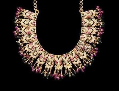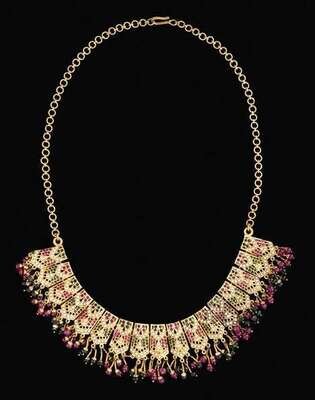 23 karat yellow gold emerald and ruby seed pearl necklace egyptian revival
