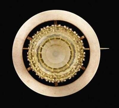 Round cushion cut citrine stone, of fair color set into a rose gold brooch setting.