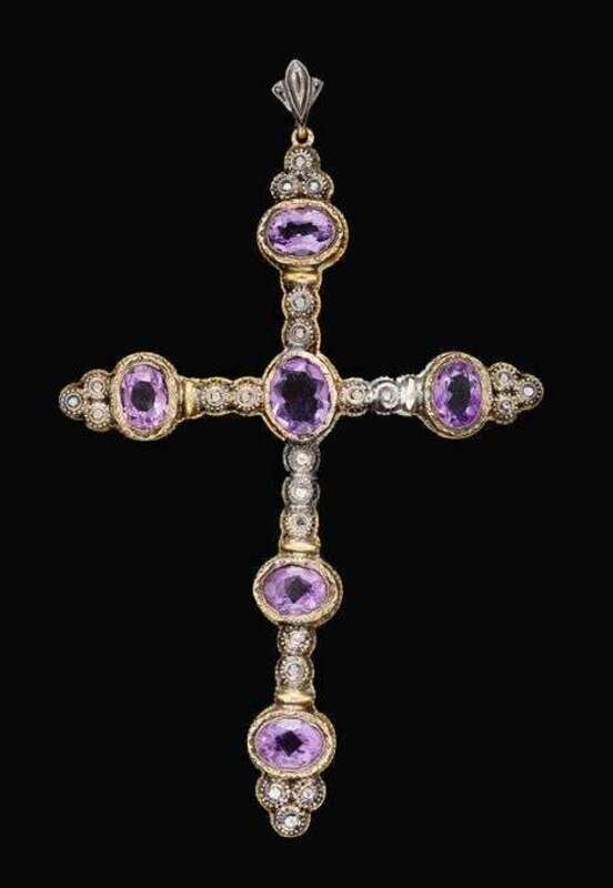 Cross pendant with six amethyst stones and petite rose cut diamond chips. Displays metal hallmarks. Note: This cross would have been worn with a riviere necklace, a simple necklace design of the early 19th century.