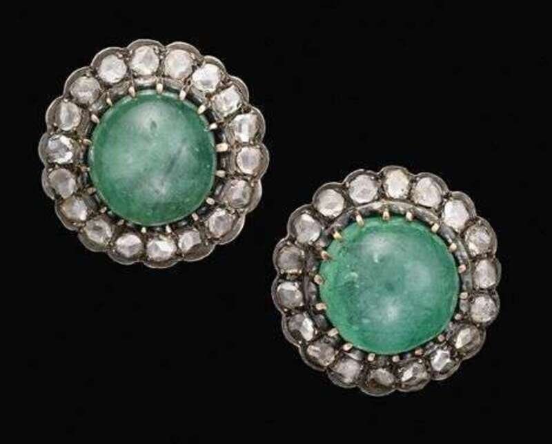 Sterling silver and 14 karat yellow gold clip earrings with central cabochon emerald surrounded by eighteen petite rose cut diamonds.