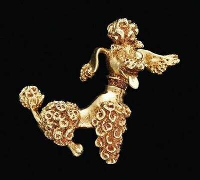 Yellow gold seated poodle pin with open mouth and playful expression.