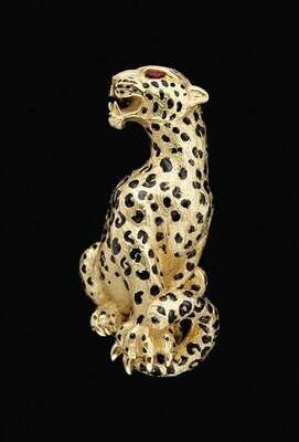 14 karat yellow gold "leopard" brooch with ruby eyes