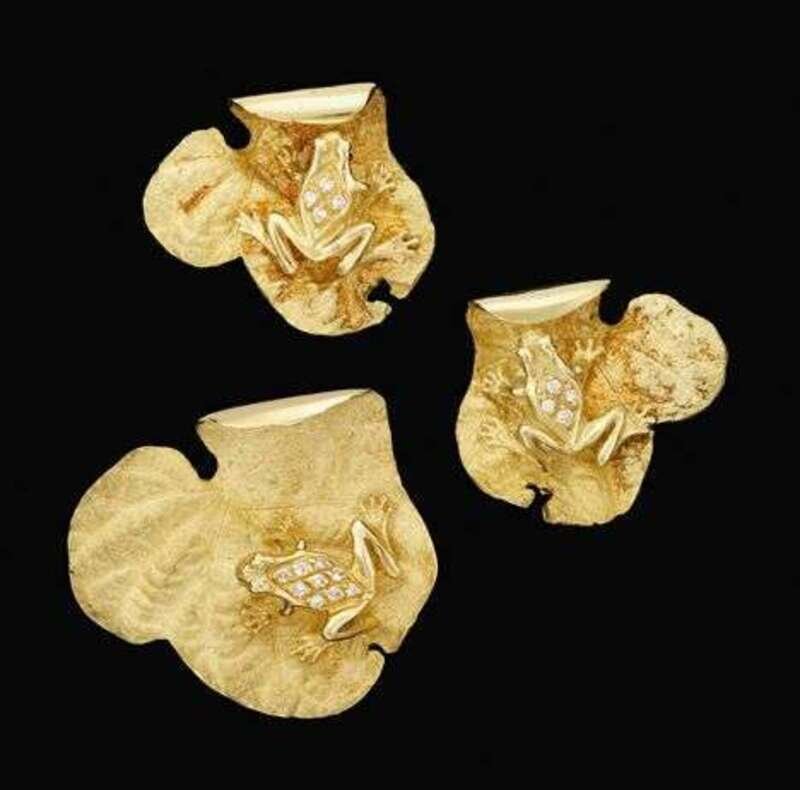 Unusual brushed yellow gold lily pad earrings and matching brooch each displaying a single petite polished frog accented with petite round cut diamonds on torso, clip back.
