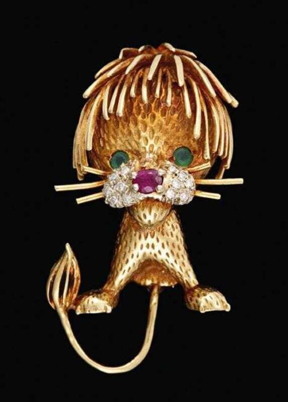 Brooch with 12 petite diamonds set in head, ruby nose and emerald eyes. Textured yellow gold body is marked 18 karat.
