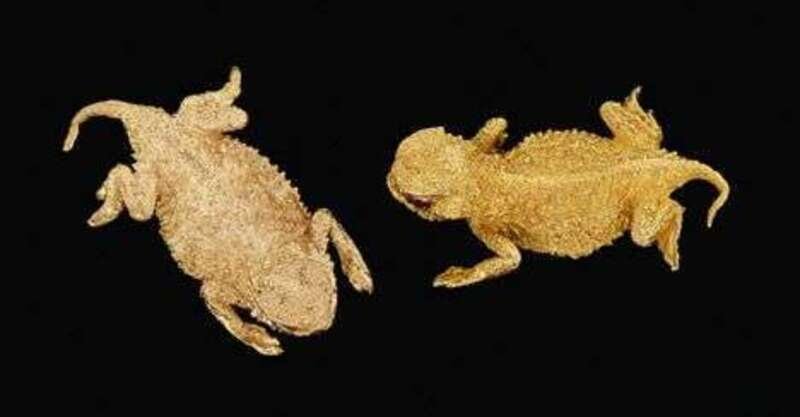 Twin reclining "horny toad" lizard tie tacks, yellow gold lizard with ruby eyes, and the second simple rose gold.