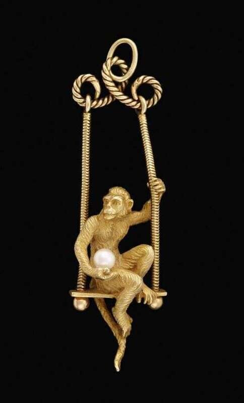 Whimsical monkey on rope swing holding a single white cultured pearl.