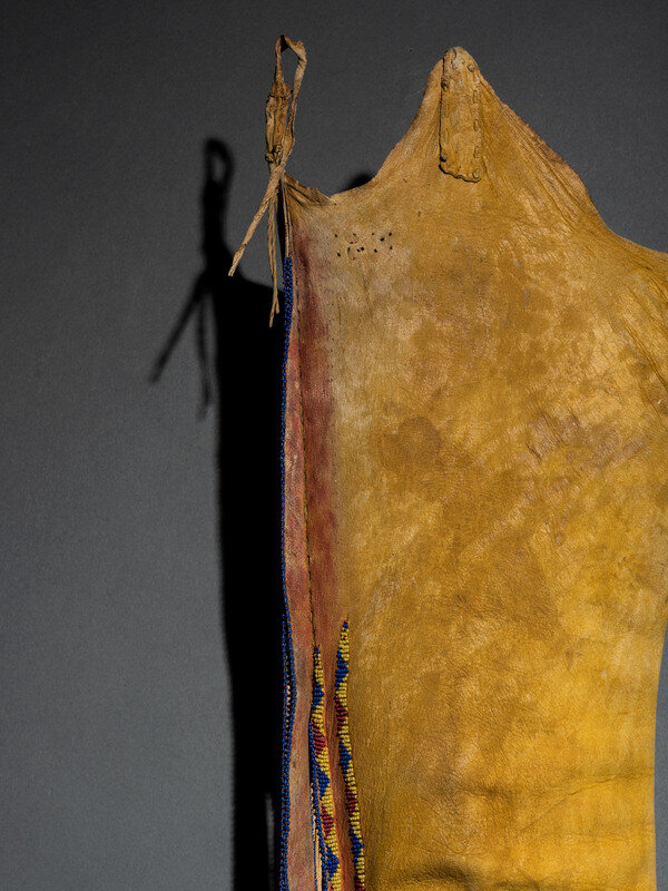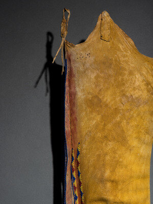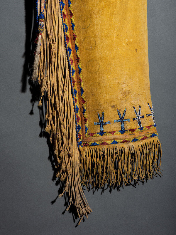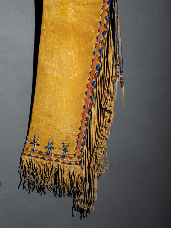 thread and sinew-sewn softly tanned hide; having lanes of beadwork in colors of greasy yellow, dark blue, red white-heart, faceted light blue and cobalt; long tabs edge-beaded and finished with horsehair; twisted cotton cord fringe; red and yellow pigments