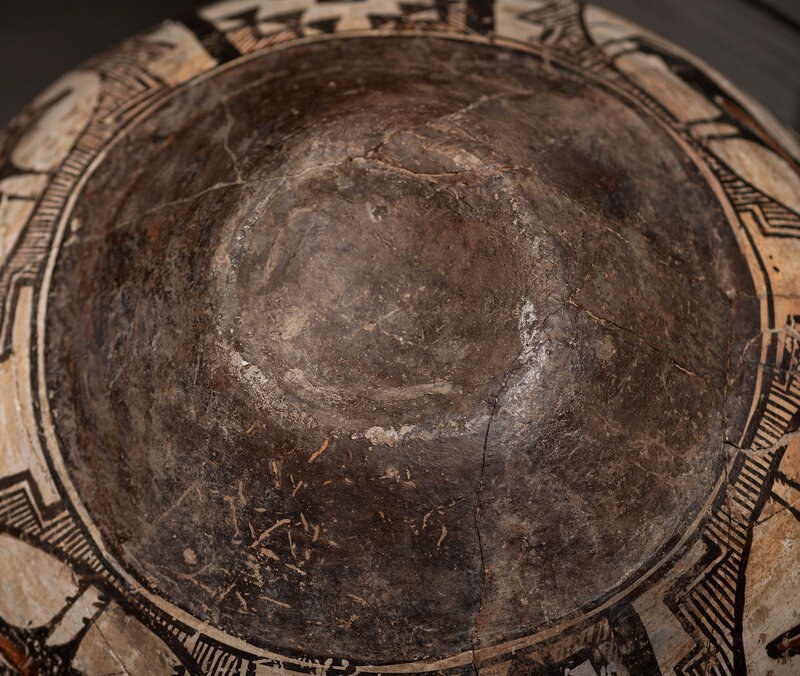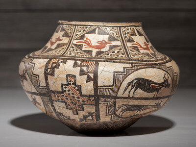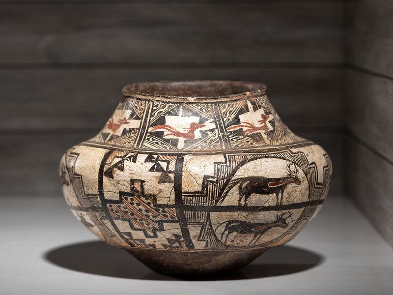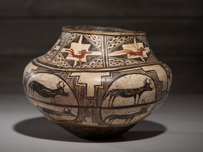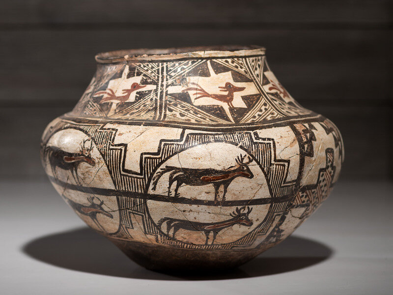 having a concave base, squat form, and elongated neck; a double row of heartline deer decorate body and birds beneath the rim