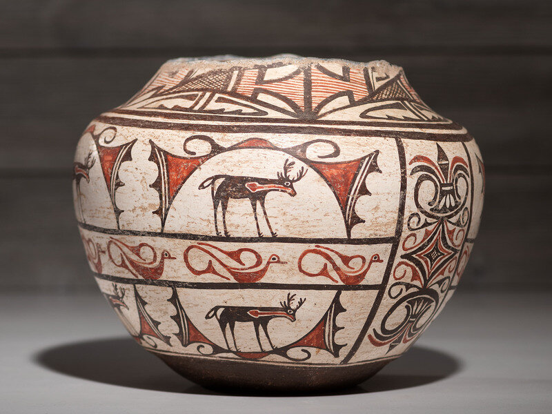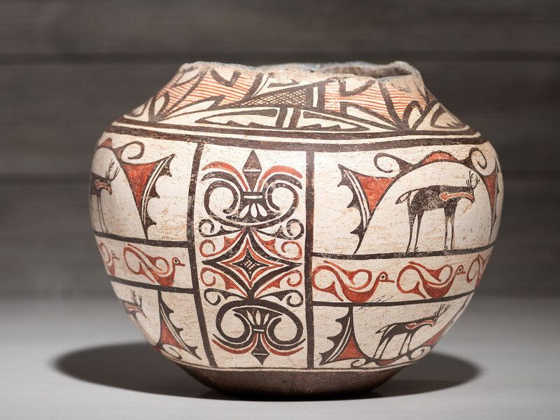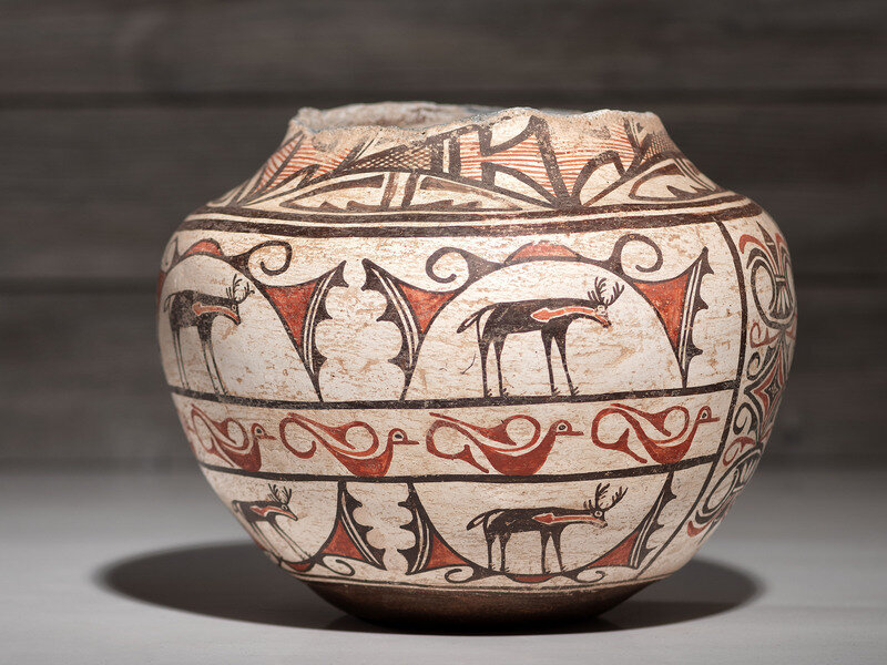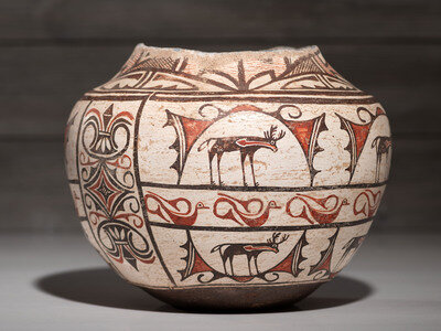 having a concave base and globular body; designed with heartline deer, birds, and vertically oriented geometric friezes