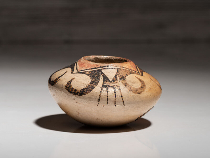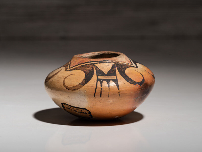 decorated with winged elements descending from the rim; with Hopi Villages sticker on base