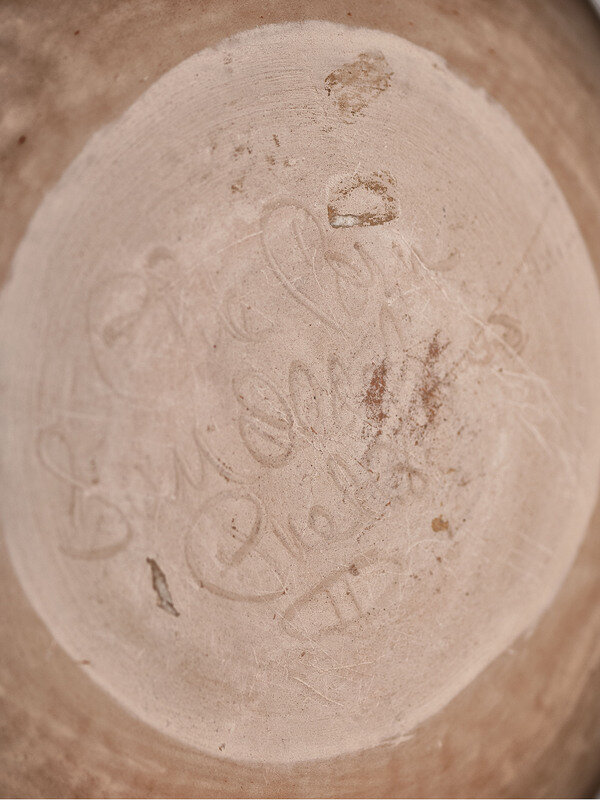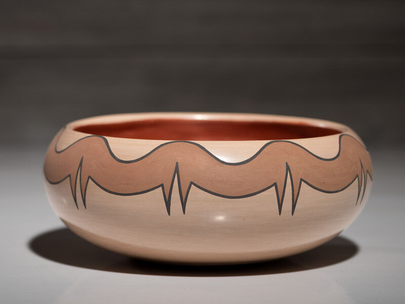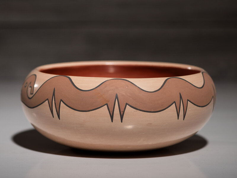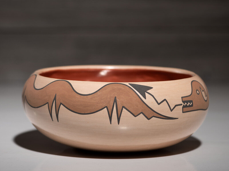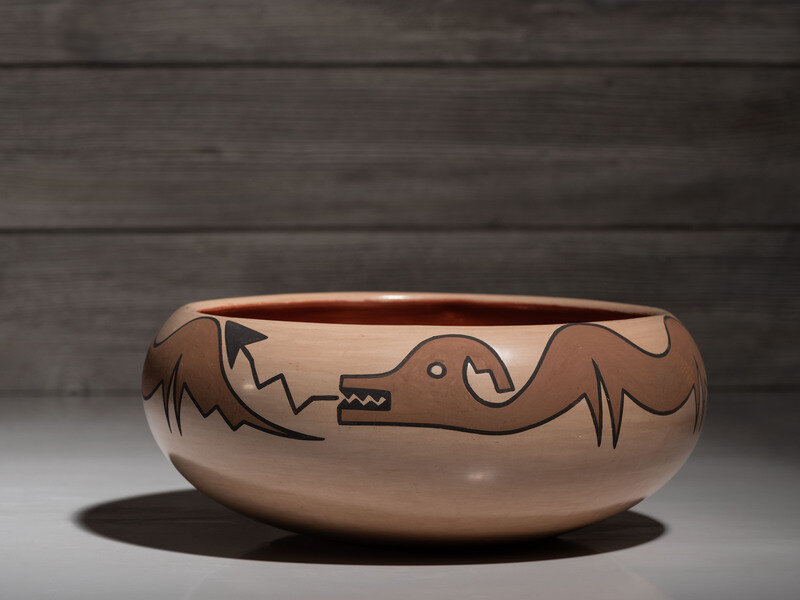 bowl having a buff exterior and painted with Avanyu; red interior; signed on base
