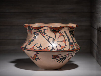 having an overall form of a blossoming flower and painted with florally inspired geometric design; signed on base