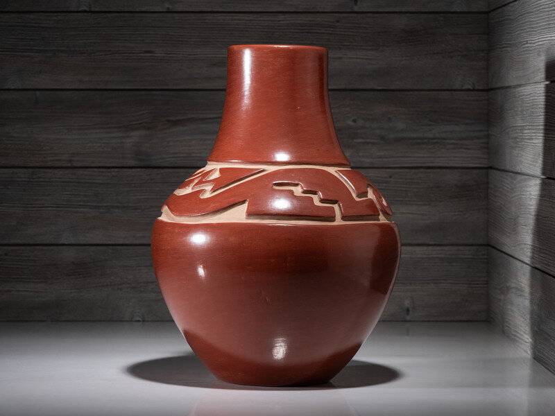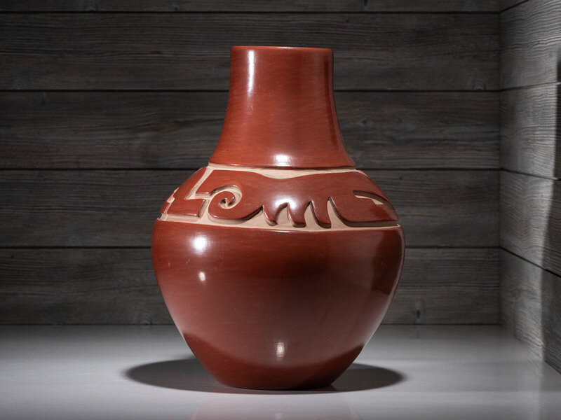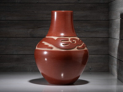 Carved Redware Pottery Vase, with Avanyu