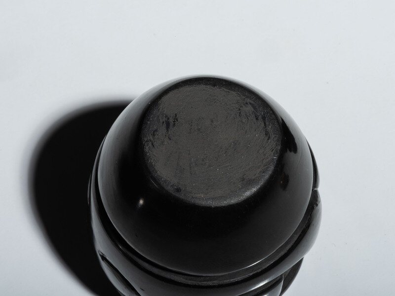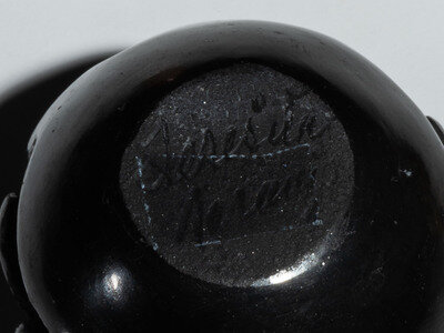 a smaller blackware jar with carved geometric elements; signed Teresita Naranjo (Santa Clara, 1919-1999)
