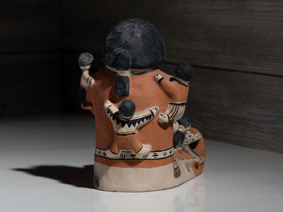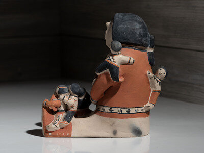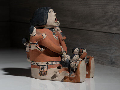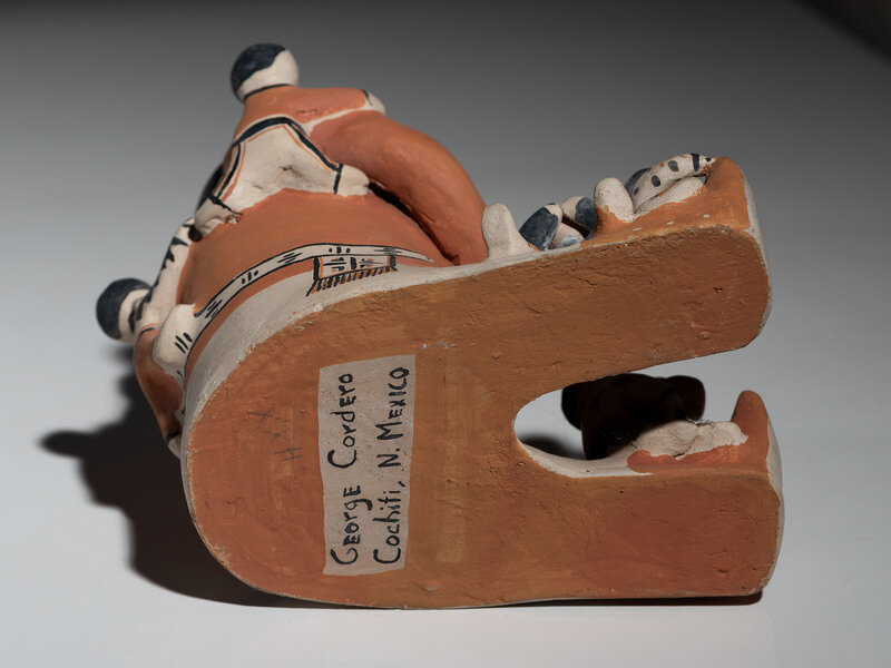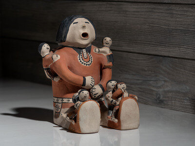 seated male figure with seven crawling children; signed on base GEORGE CORDERO COCHITI, N. MEXICO