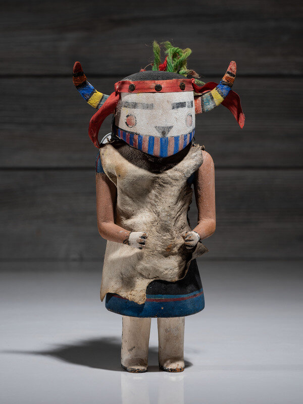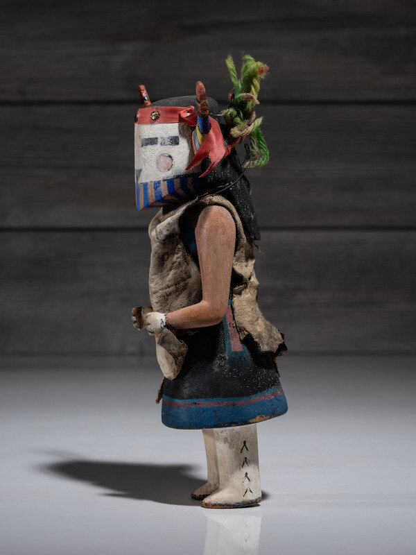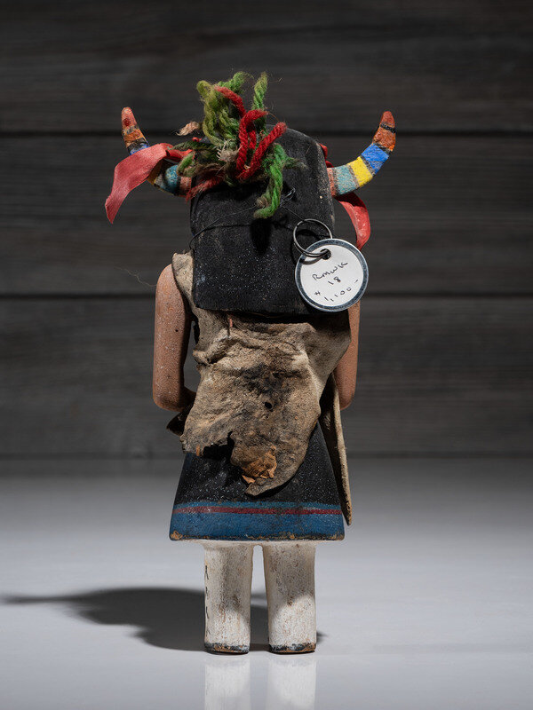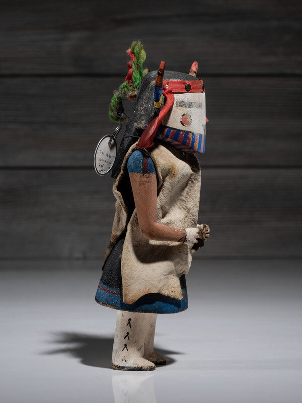 having a painted dress and covered with hide garment; red ribbon tacked to crown; remnants of old paper tag on back