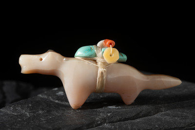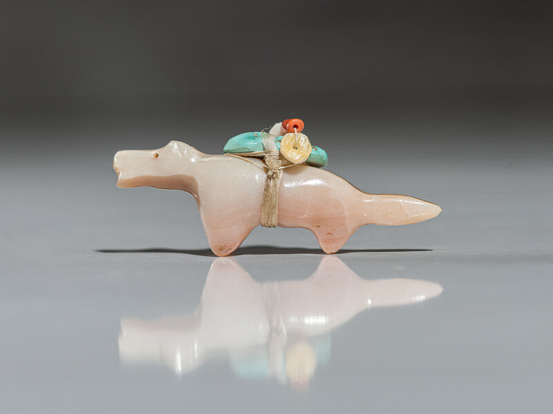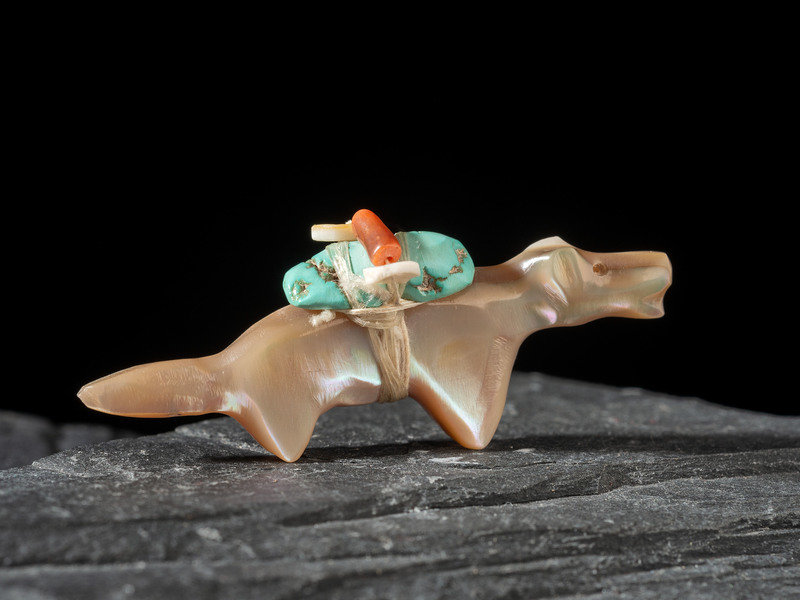 carved of shell with a turquoise nugget, heishi, and coral strapped by sinew to back; not signed