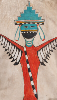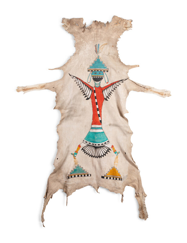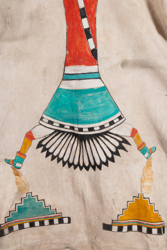 softly tanned hide, painted in blue, yellow, and red-orange; signed lower right