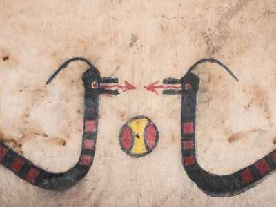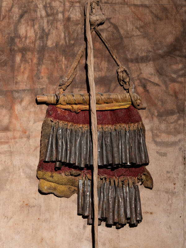 thread-sewn canvas kilt with two facing Avanyu painted in black, red, and yellow; red and yellow painted buffalo hide bag with two rows of tin cones; lower hem made of painted buffalo hide with tin cone fringe