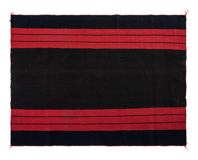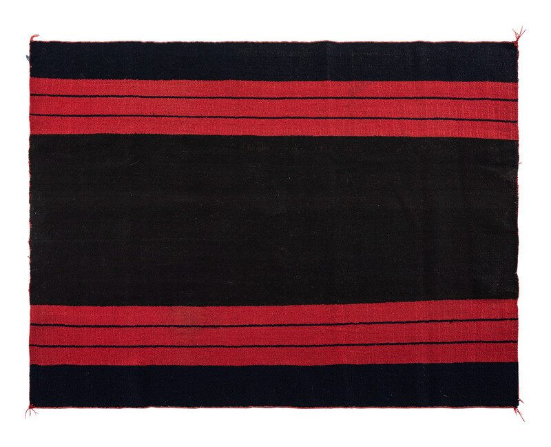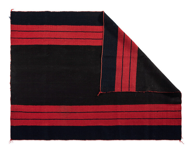 hand-spun wool woven in colors of indigo, cochineal, and black; indigo bands having a diamond twill, red bands with a herringbone weave, and central black panel with a diagonal twill