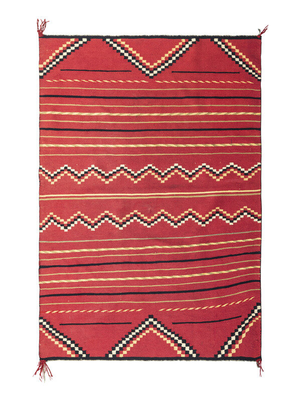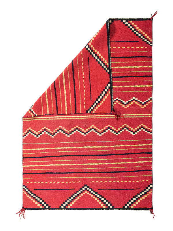 hand-spun wool woven in colors of indigo, yellow, green, white, and red; stepped zigzags and "barbershop pole" bands