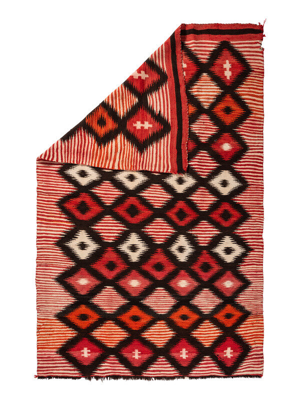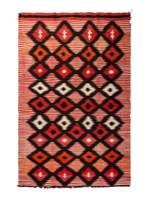 thick, hand-spun wool woven with an overall design of connecting diamonds against a background of alternating red and white stripes; dark brown warps