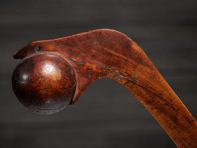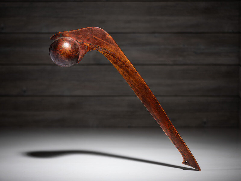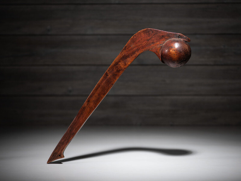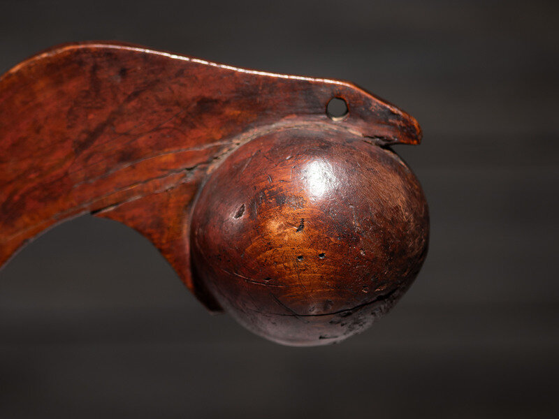 possibly Ojibwe; having the stylized form of a serpent eating an egg depicted with mouth open grasping the ball head; haft tapers to a triangular point