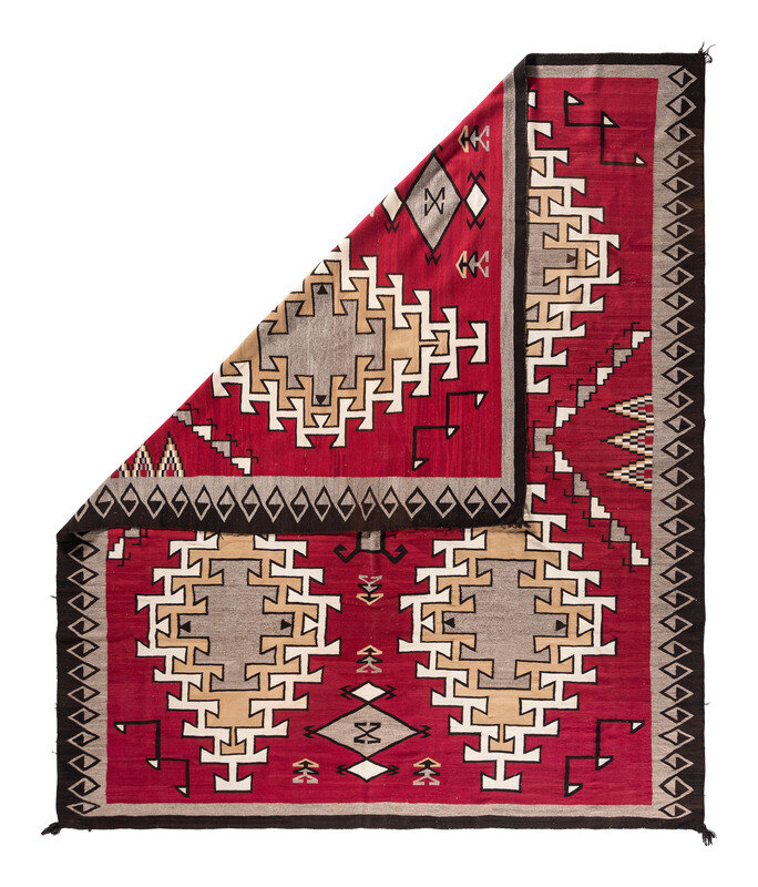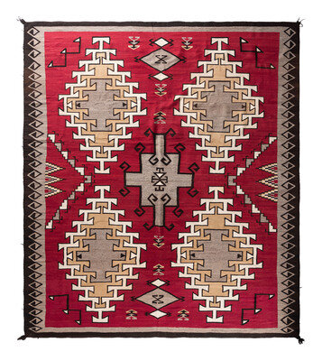 handspun wool woven with a multiple diamond pattern in colors of red, gray, cream, tan, and dark brown