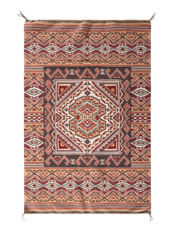 finely woven and of near tapestry quality; designed using colors of pinks, greens, tans, and blues; approximately 64 wefts/inch, 16 warps/ inch